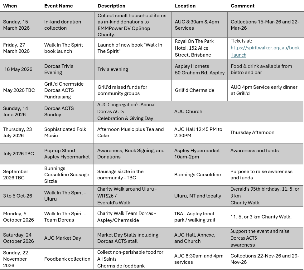 That is why I am delighted to announce our first national event: Walk in the Spirit 2026. On Monday 5 October 2026, a flagship 11 km walk will take place around Uluru, led by Everald and Helen Compton in celebration of Everald’s 95th birthday. Alongside this, local neighbourhood walks (3 km, 5 km or 11 km) will happen across Australia, with a target of 1,000 walkers nationwide and a fundraising goal of $100,000. Here in Queensland, our Board will lead an Aspley/Chermside walk, and other community walks—such as Sunshine Coast and Tweed Valley—are being planned so people can participate close to home. I invite you to take one next step today with us. Register to walk, volunteer, or donate at spiritwalker.org.au. If travelling is not possible, please lead a local team, sponsor a walker, or share the event with your networks. If you represent a business or partner organisation, we welcome workplace fundraising, sponsorship, and referrals through recognised services. Thank you for standing with Dorcas ACTS. Together, swift compassion can become a lifeline—and a lifeline can become a new beginning.