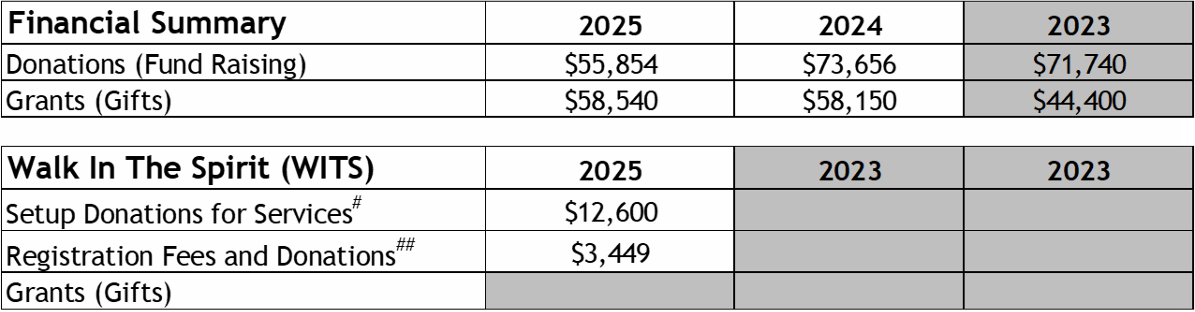 Note all expenses are donated as in-kind donations or cash is given for purchasing a specific expense; 100% of fund-raising donations go to Dorcas ACTS.
