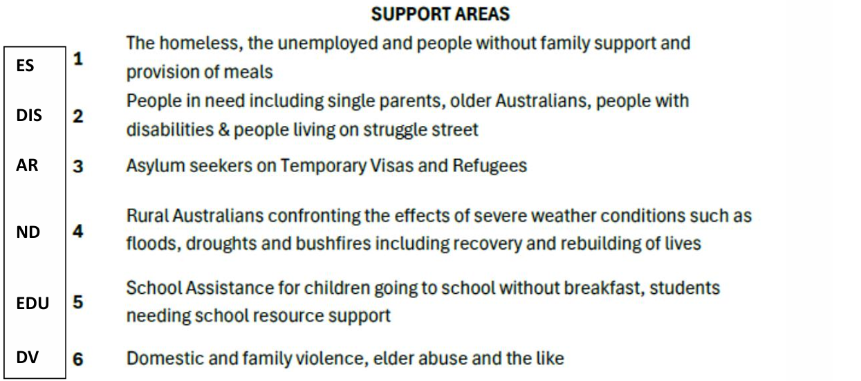 Finally, please let us know whenever you meet a group advocating for someone in real strife who needs our help. We accept referrals from recognised local support agencies, churches and other credible sources assisting those in crisis.